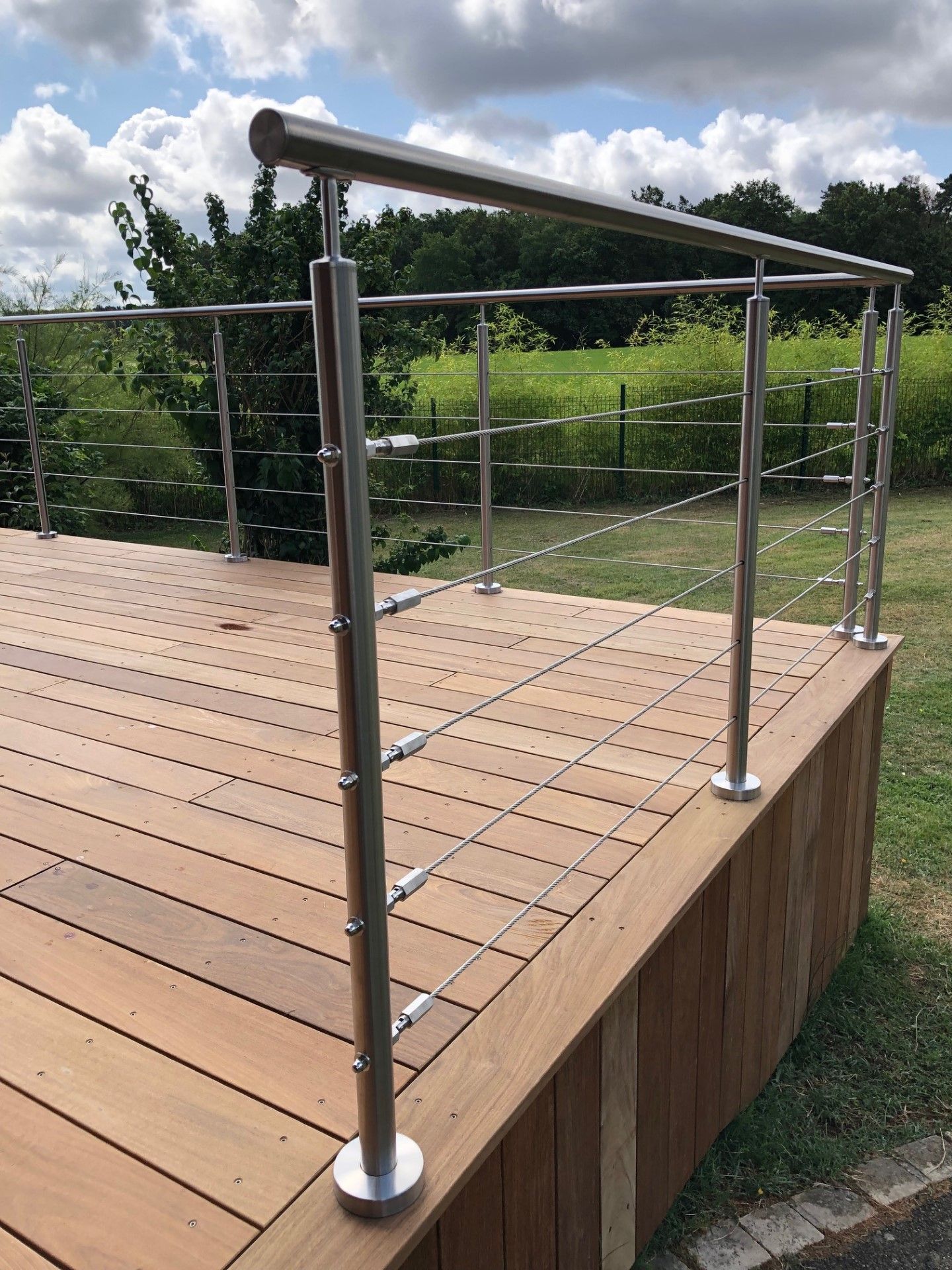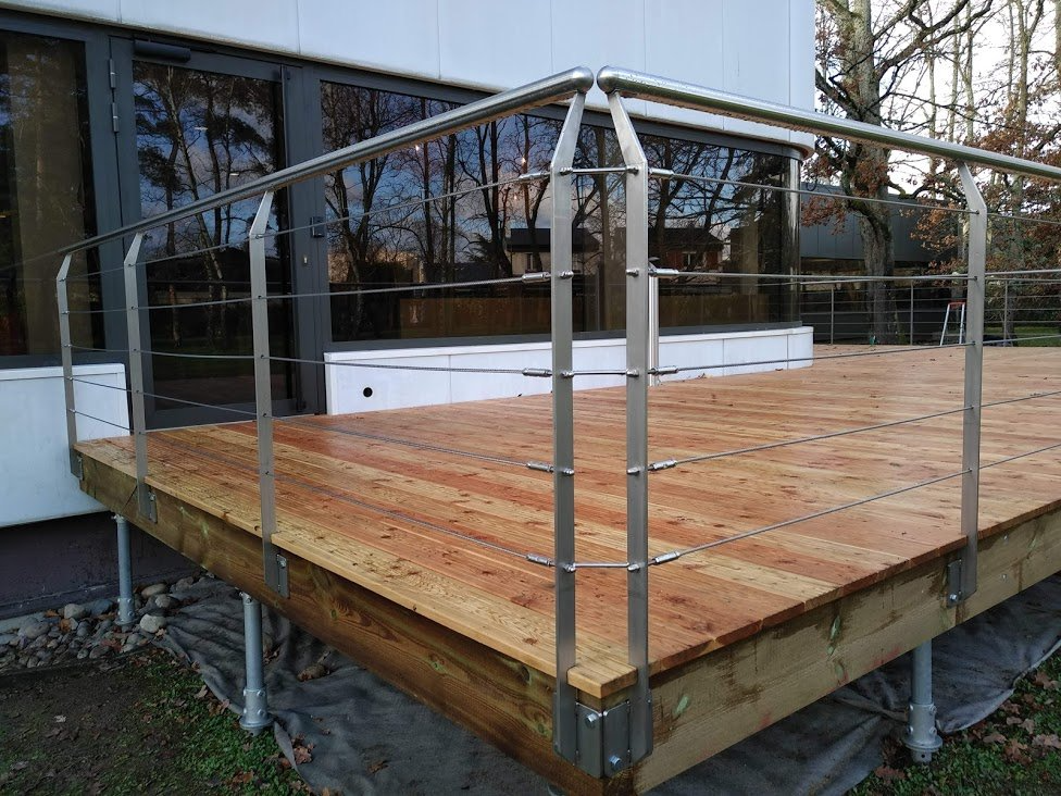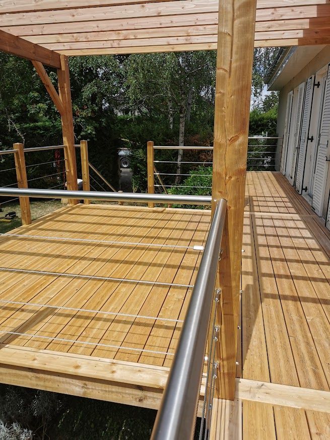 Nous réalisons également l'aménagement de votre terrasse grâce à l'intégration d'un escalier extérieur en bois, de marches, de garde-corps, etc.